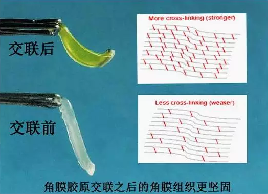 角膜胶原交联的原理是以核黄素为光敏剂,运用一种特殊波长的紫外线对角膜局部进行照射,刺激胶原纤维进行交联反应,改善角膜的生物力学特性,从而使角膜的机械强度增加。研究表明:经后的角膜强度可以提高3倍。圆锥角膜患者通过角膜胶原交联可有效避免病情的进一步恶化。
